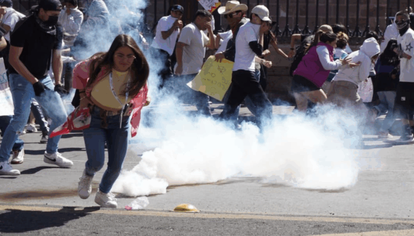 La protesta se realizaba en el Centro Histórico de la capital michoacana, cuando encapuchados se enfrentaron con policías de la entidad, quienes intentaron dispersar a los manifestantes lanzando gases lacrimógenos.